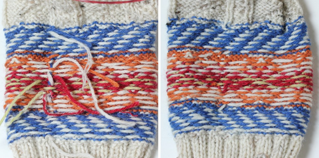 When the new colour yarn is started, instead of leaving a long tail to be dealt with later, I make a loop at the yarn end. This loop is used to make the first stitch. So there are no ends to hide, no ends – and no tears!