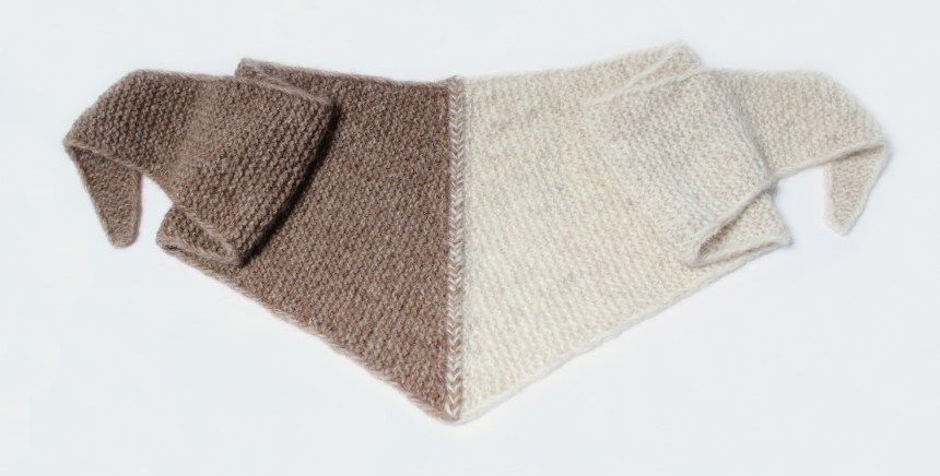 The photo below shows the process of working Distich SRG on the shawl presented in the book. The Oat Plait Shawlette is worked in Garter stitch with slip DS selvedge, two coloured triangles are connected in the centre with the decorative plait.