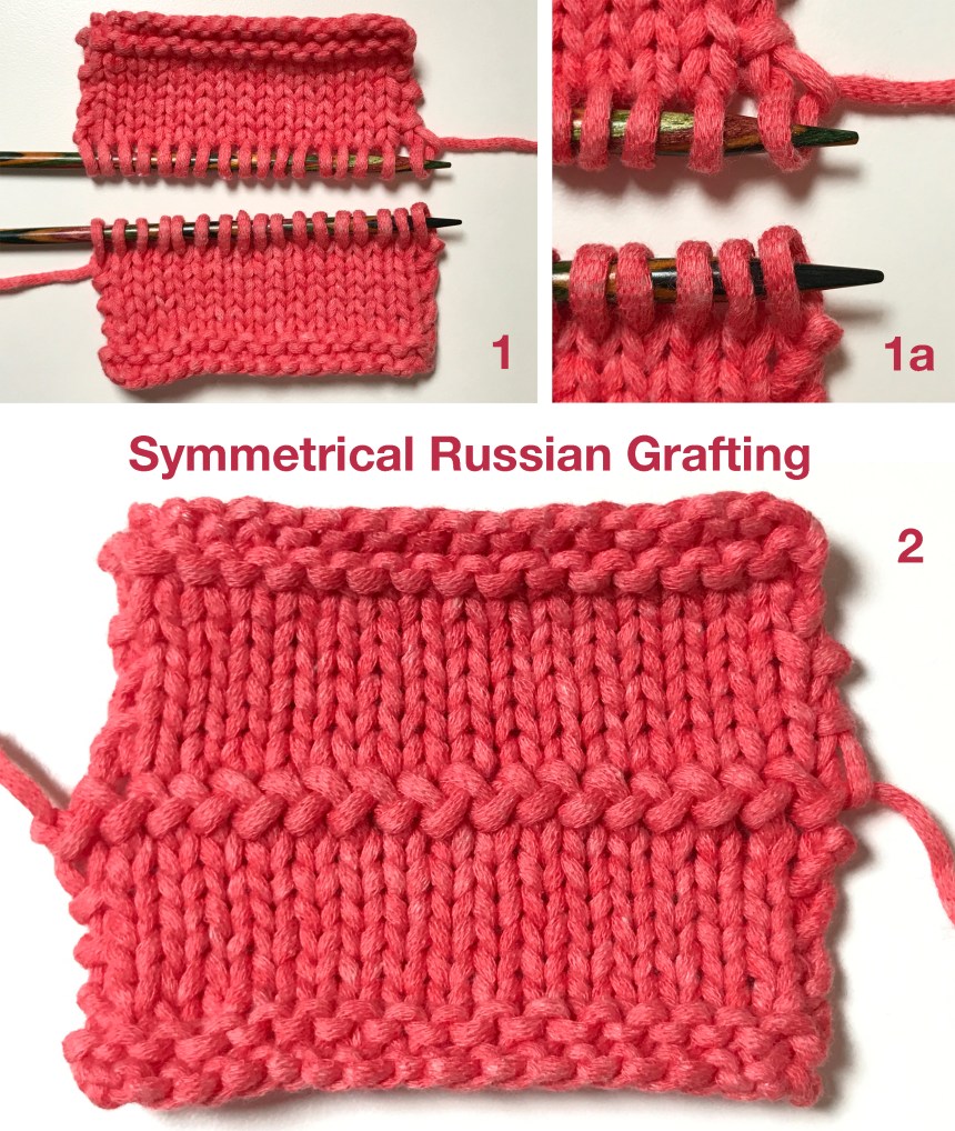 In many existing instructions and videos RG is worked by slipping sts knitwise from both needles. This way the seam is not symmetrical, because the back needle sts are twisted. To keep them open (like the front sts), they need to be slipped purlwise. Compare Symmetrical Russian Graft (SRG) on the left and Russian Graft (RG) on the right.