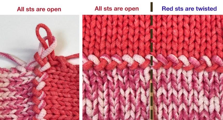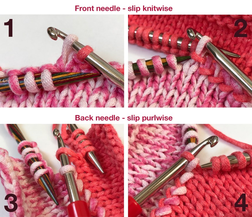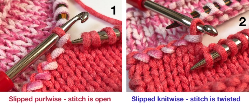 These close-up pictures show how the back needle stitch is twisted when it is slipped knitwise (2). When it is slipped purlwise it is open (1).