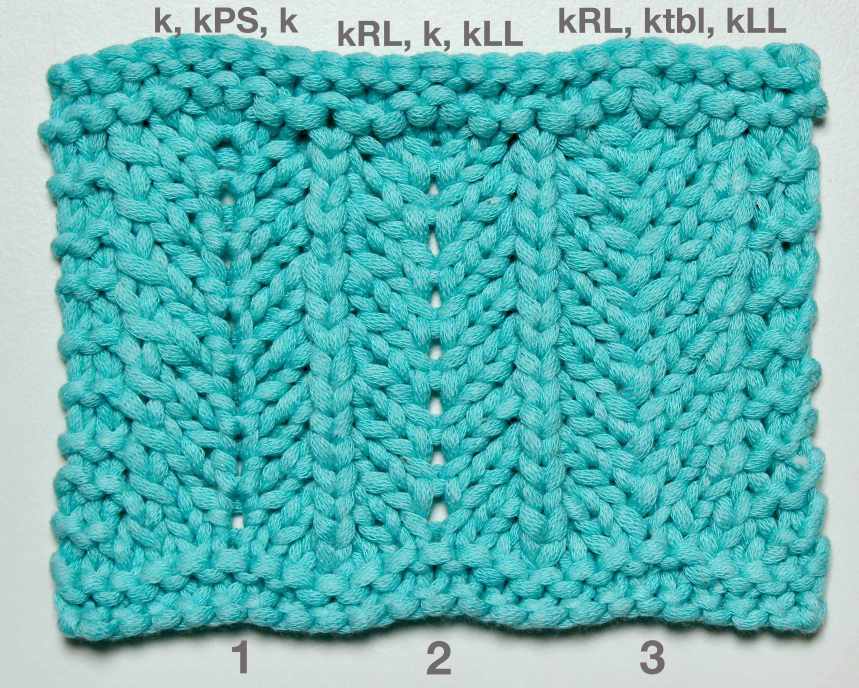 - kRL, k, kLL – here the central st is worked only once between two lifted increases: knit into the right leg of PS, k1, knit onto the left leg of PS; when stacked they create a vertical line of accurate narrow holes, this is a very popular increase;